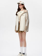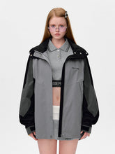 This mid-length windbreaker jacket features a stylish colorblock design with raglan sleeves, offering a chic and practical option for windy weather.