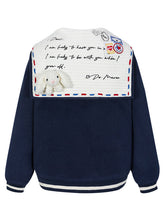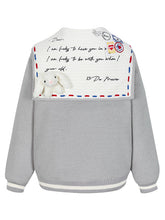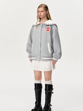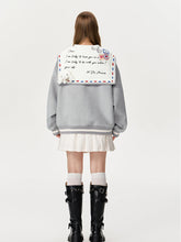 This tweed baseball jacket features a unique sailor collar and a playful "love letter" theme. The jacket is made with a soft wool blend, offering a cozy feel and vintage-inspired design, perfect for fall and winter layering. Available in classic navy and gray.