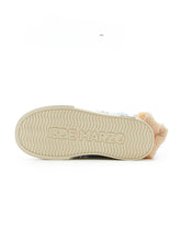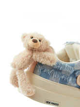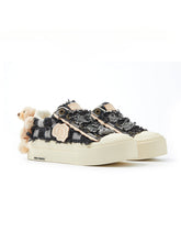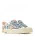 These denim sneakers feature a fun badge design with bear details. Made of woven fabric and cowhide leather, they are durable and perfect for a casual yet stylish look. The flat sole and rounded toe make them ideal for all-day wear, and the bear accents add a touch of playful charm.