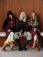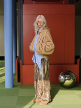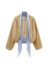 This eco-friendly fur jacket features a color-block design with luxurious rabbit fur accents. The standout feature is its stylish tie detail, adding a touch of flair to this warm and elegant piece. Ideal for layering in cooler weather.
