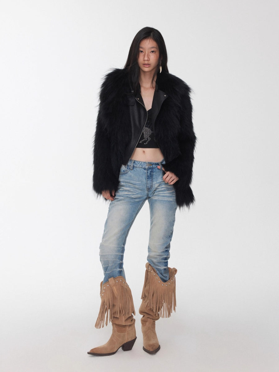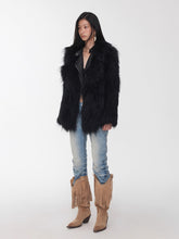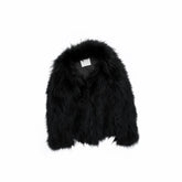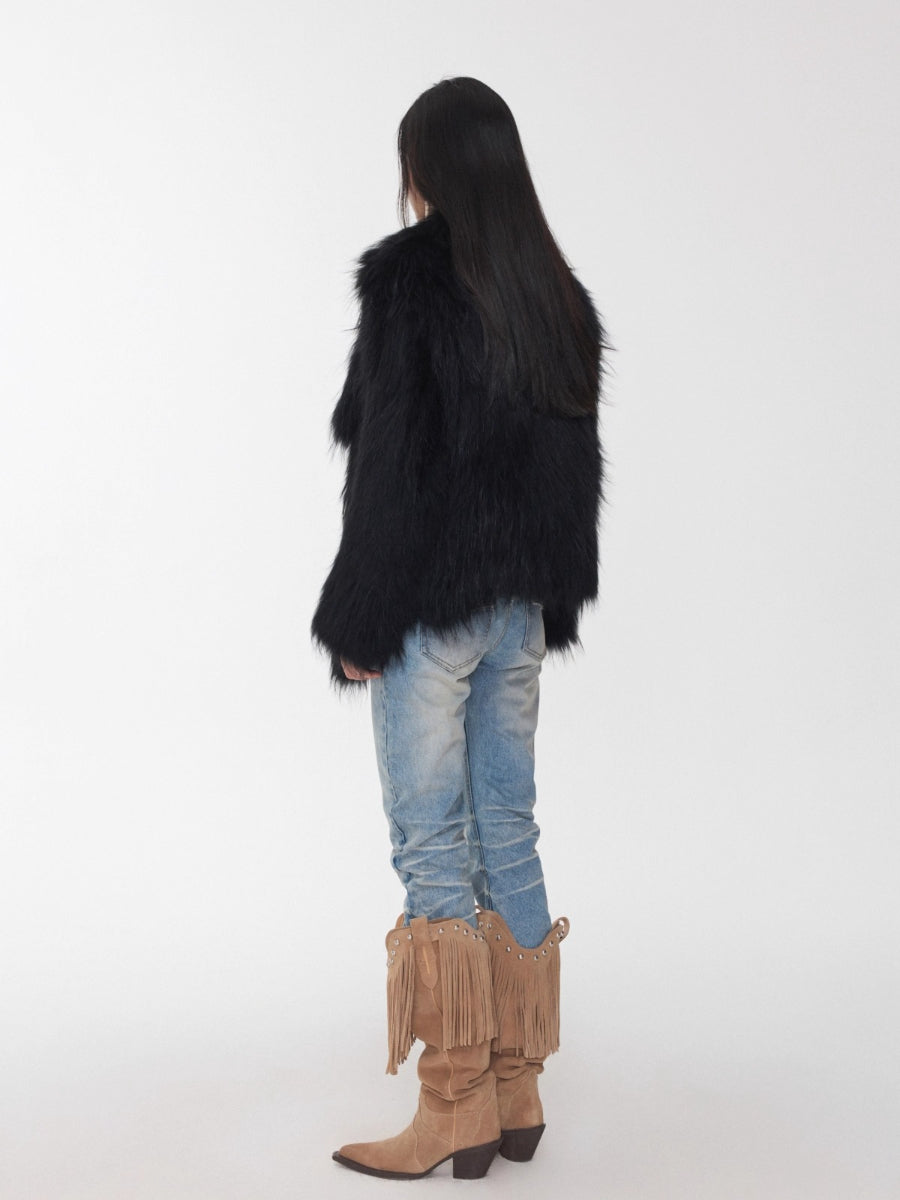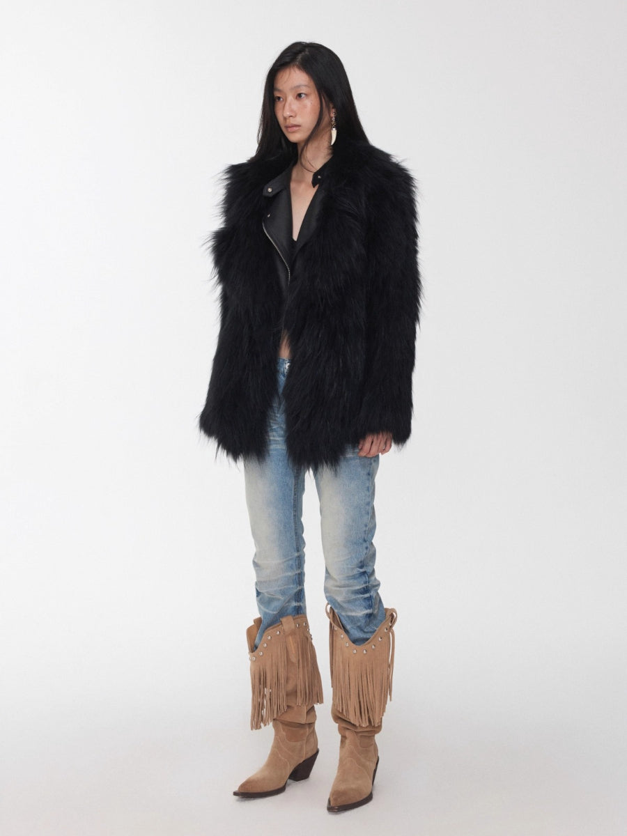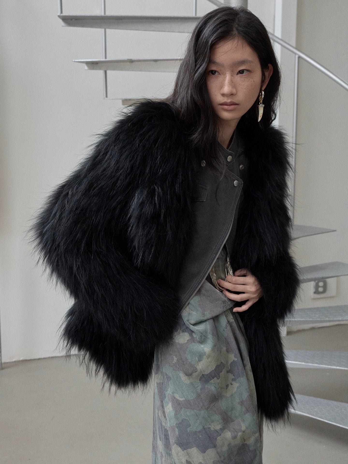 Made from premium natural raccoon fur, this luxurious knit coat combines lightweight warmth with soft volume and texture. Featuring a wide blazer lapel and a relaxed silhouette with a longer back hem, it provides both coverage and effortless elegance. The hidden hook closure maintains a clean finish, while the plush texture adds refined comfort and sophistication. Each piece is individually hand-dyed in ombre tones of caramel, black, and chocolate, creating unique depth and high-end visual warmth for winter styling.