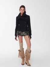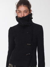 This short fitted wool jacket features a structured silhouette refined by multiple curved seam lines for precise shaping. Designed with an ultra-high collar and asymmetrical front placket, it redefines classic tailoring with modern proportion. Natural horn-style buttons lend a touch of heritage elegance, while subtle flowing trims at the placket add sophistication. Made from a 70% wool blend, the dense fabric delivers both warmth and texture, achieving a timeless fusion of classic chic and contemporary Parisian charm.