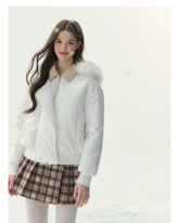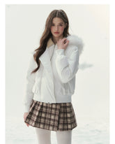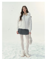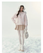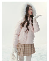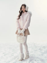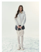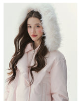 This down coat features a soft blended shell with a smooth drape that keeps its structure while remaining lightweight and comfortable. The plush faux-fur collar and cotton-filled neckline create a warm, enveloping winter look, while the detachable hood and metal-tipped ties add sweetness and functionality. The double-layer placket offers wind protection, and the shaped hem and adjustable cuffs enhance comfort and mobility. Filled with 90% white duck down, it provides reliable warmth for everyday winter wear.