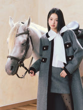 This elegant long wool coat features a classic Chanel-inspired design, crafted from high-quality black woven fabric. It combines style and warmth with its cozy layered feel and tailored fit. The coat is designed with a decorative bow and four functional pockets, making it both stylish and practical. It’s perfect for winter, offering a refined look for casual or formal occasions.