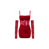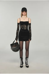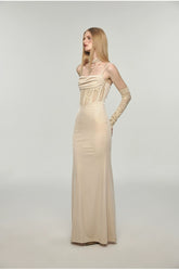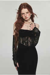 A slim-fit, long velvet bodycon dress featuring fishbone straps that beautifully contour the body. The fabric is soft and stretchable, offering a comfortable and elegant look for evening wear or formal occasions. The dress is designed with a body-hugging fit to emphasize the natural curves while ensuring comfort for extended wear.