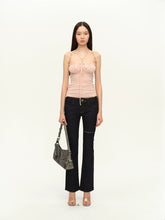 These slim-fit dark denim jeans feature a flattering low-rise waist with lace panel cutout accents at the thigh and back for an added sense of allure. The stretchy fabric hugs the curves, while premium stitching and the Dotyears official metal button at the waist reflect quality craftsmanship. A perfect blend of sensuality and confidence.