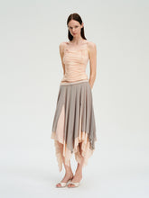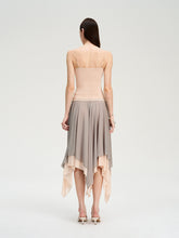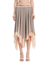 This airy midi skirt features contrasting mesh panels and a flowing, flared silhouette. The elastic waistband is hidden beneath the double-layer hem for a sculpted yet comfortable fit. Perfect for effortless style and movement in any season.