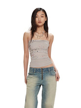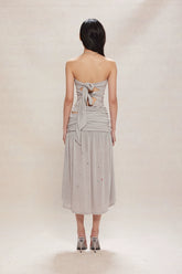 This knit matching set features a gray rhinestone tube top with tie straps and coordinating pants. The stretchy acetate-poly blend fabric hugs the body comfortably, with subtle sparkle detail for a glamorous touch. A fashionable outfit for confident and stylish women.
