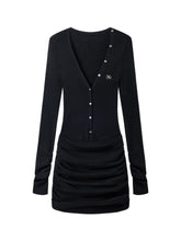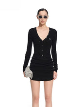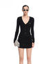 This elegant knitted dress combines wool and cashmere for a soft yet structured texture. Designed with a deep V-neckline and sculpted waist, it accentuates the body’s curves while maintaining comfort. The draped hemline adds a fluid silhouette, offering both femininity and sophistication. Ideal for autumn and winter occasions where warmth meets refined minimalism.