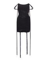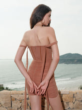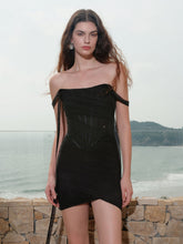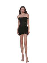 The off-shoulder strap design accentuates the curves of the upper body with a flattering fit. The layers add a sculptural effect, while the smooth waistband detailing highlights the waistline with a refined touch. The crisscross and pleated skirt design beautifully shapes the silhouette and visually elongates the legs. The long hanging strap enhances the elegance of the overall look and can be worn as a sash or a tie for added versatility.