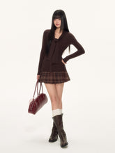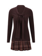 This dress combines a soft knit upper with a vintage-inspired plaid pleated skirt, creating the illusion of a layered two-piece look. The gentle drape of the knit fabric pairs naturally with the structured pleats, adding movement and texture. A tie-accented neckline enhances the classic academic mood, making the piece suitable for both casual styling and more polished outfits. The mixed-material construction balances comfort with refinement, offering a silhouette that feels wearable and expressive.