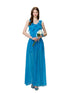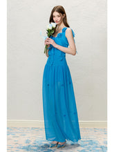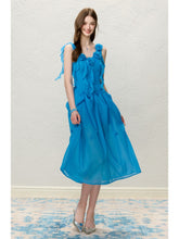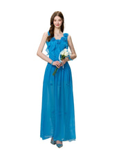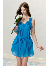 This Iceland-blue stretch mesh dress features handcrafted floral appliqués and ruffle trim. A wide neckline exposes the collarbones for a slimming effect, while the body-skimming silhouette accentuates the waist and shoulders.