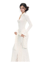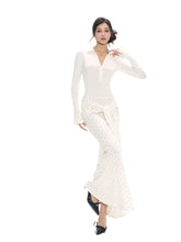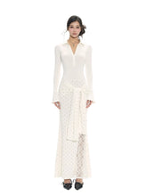 This white dress features a Henley collar with lace-spliced panels and a faux two-piece design, cinched at the waist for a slim shirt-dress silhouette.