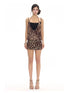 This fitted dress creates a daring illusion of layers with a built-in cami top and body-hugging silhouette. Leopard print and delicate hand-beaded embellishments highlight the edgy feminine vibe, perfect for statement summer looks or beach parties.