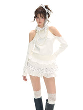 This white hoodie features spliced panels with a faux two-piece shirt collar halter neckline and off-shoulder long sleeves for a sleek, fashion-forward look.