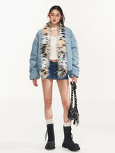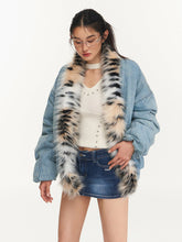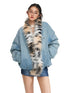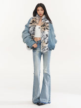 100% Cotton. Denim fabric has undergone washing, machine scraping, and multiple processes to achieve a natural denim color, showing a combination of denim fabric and faux fur. The laser-cut collar reveals a natural fur effect.