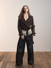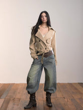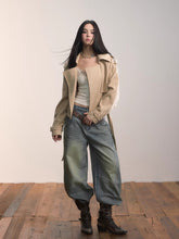 A stylish cropped trench jacket with a belted hem for adjustable waist fit. Double-breasted design with lapel collar, blending modern tailoring with relaxed street style. Slim silhouette, light to moderate thickness, and slightly stretchy fabric for versatile daily wear.