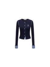 A classic autumn knit top featuring navy plaid patchwork with embroidery details. Designed in a structured shoulder cut and tailored waistline, it combines elegance with comfort. Perfect as a standalone piece for a chic seasonal look.