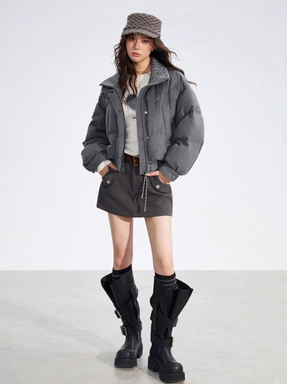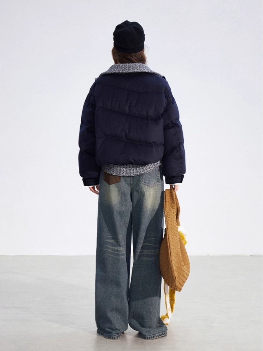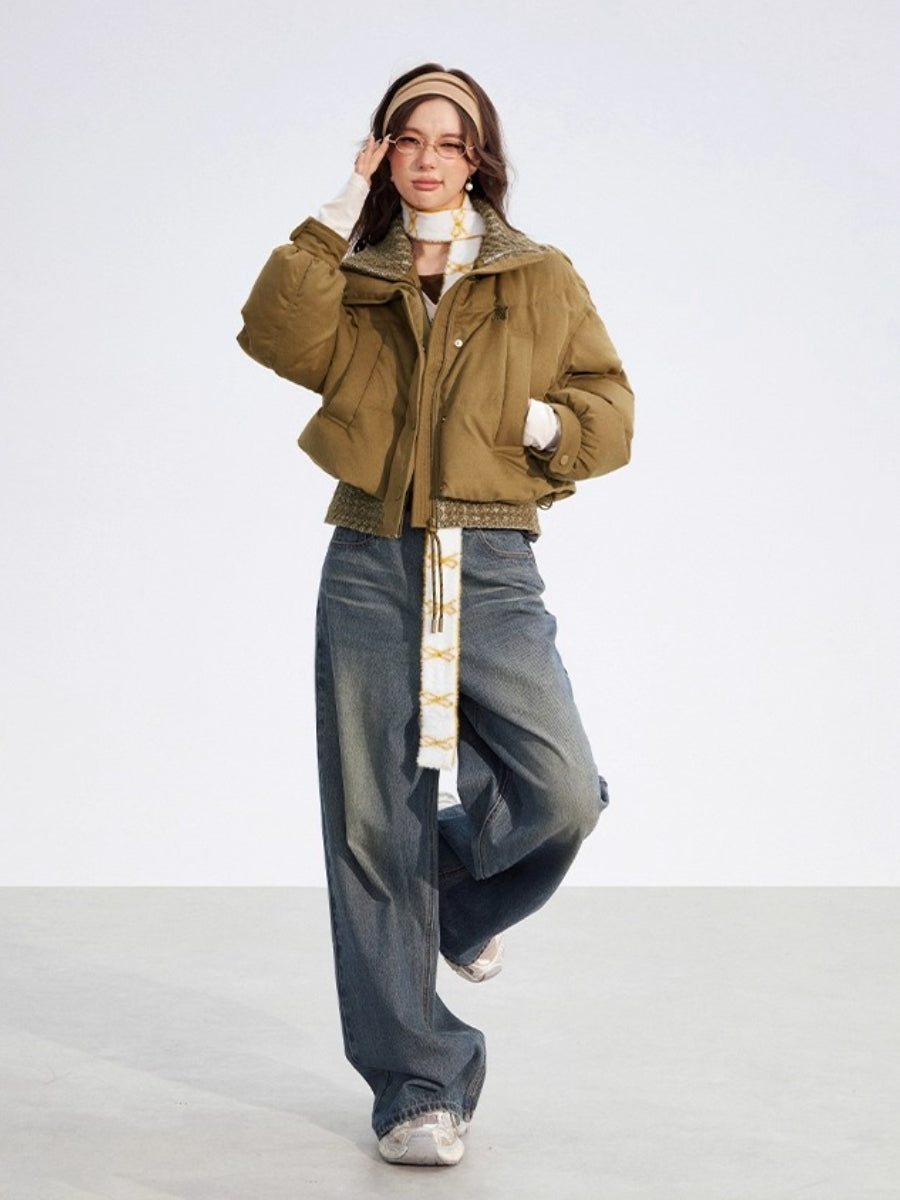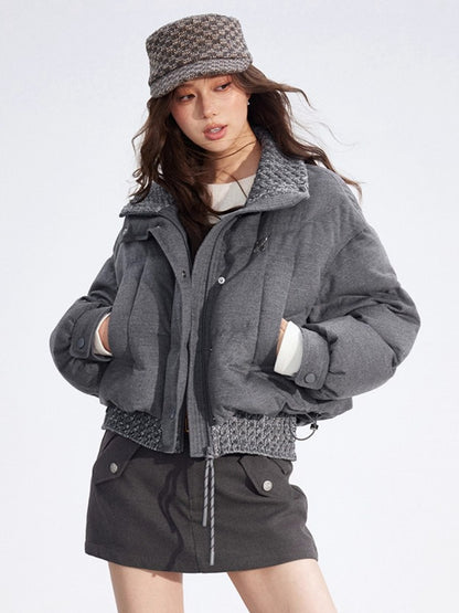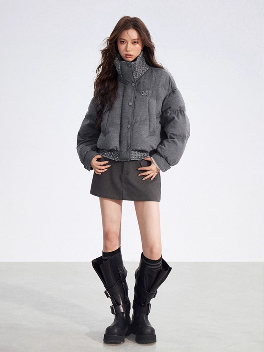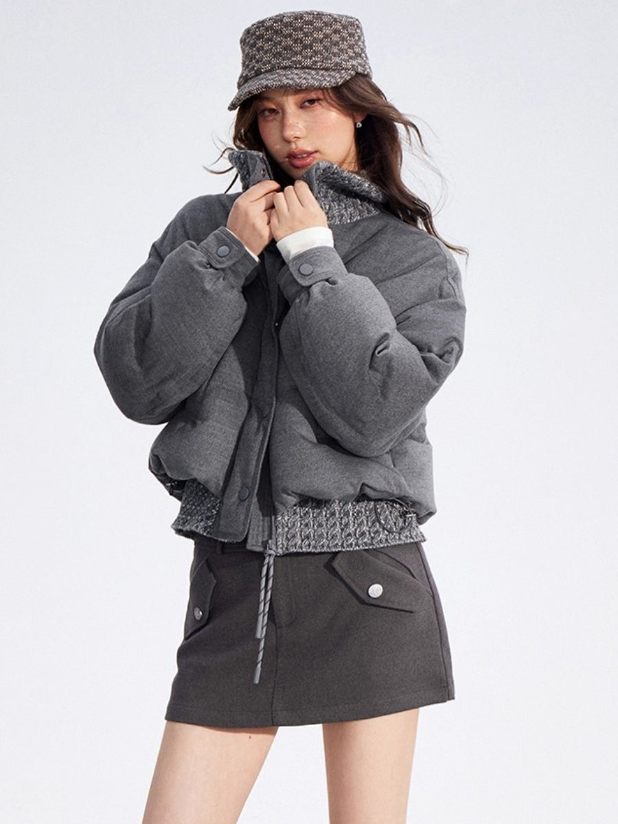 A chic short down jacket blending warm knit textures with thick wool panels for enhanced insulation and a refined layered look. Filled with 90% white duck down, it delivers superior warmth while maintaining a sleek silhouette. The cropped design elongates the body proportion, making it ideal for daily wear in cold weather.