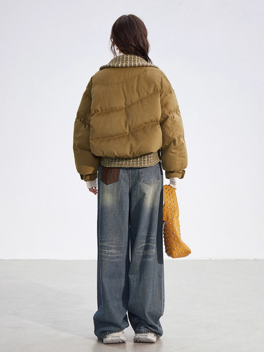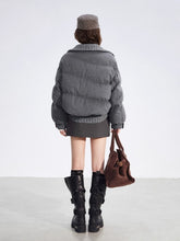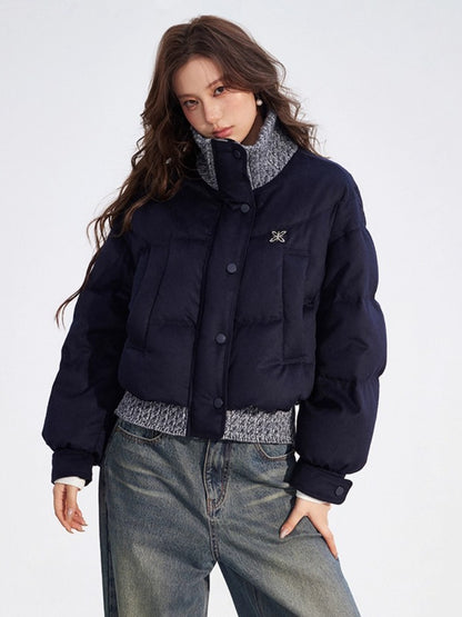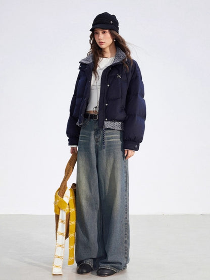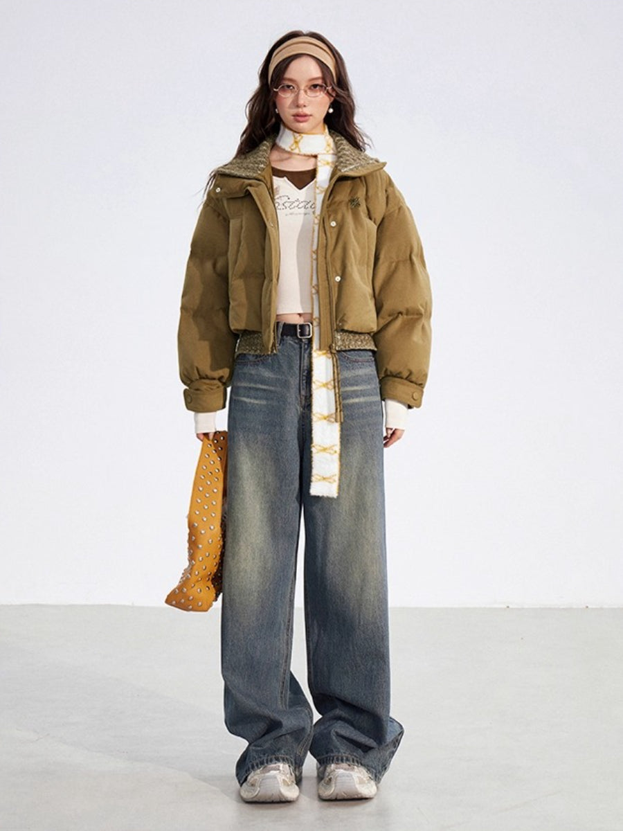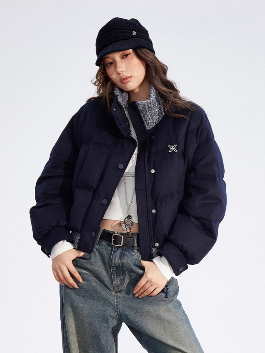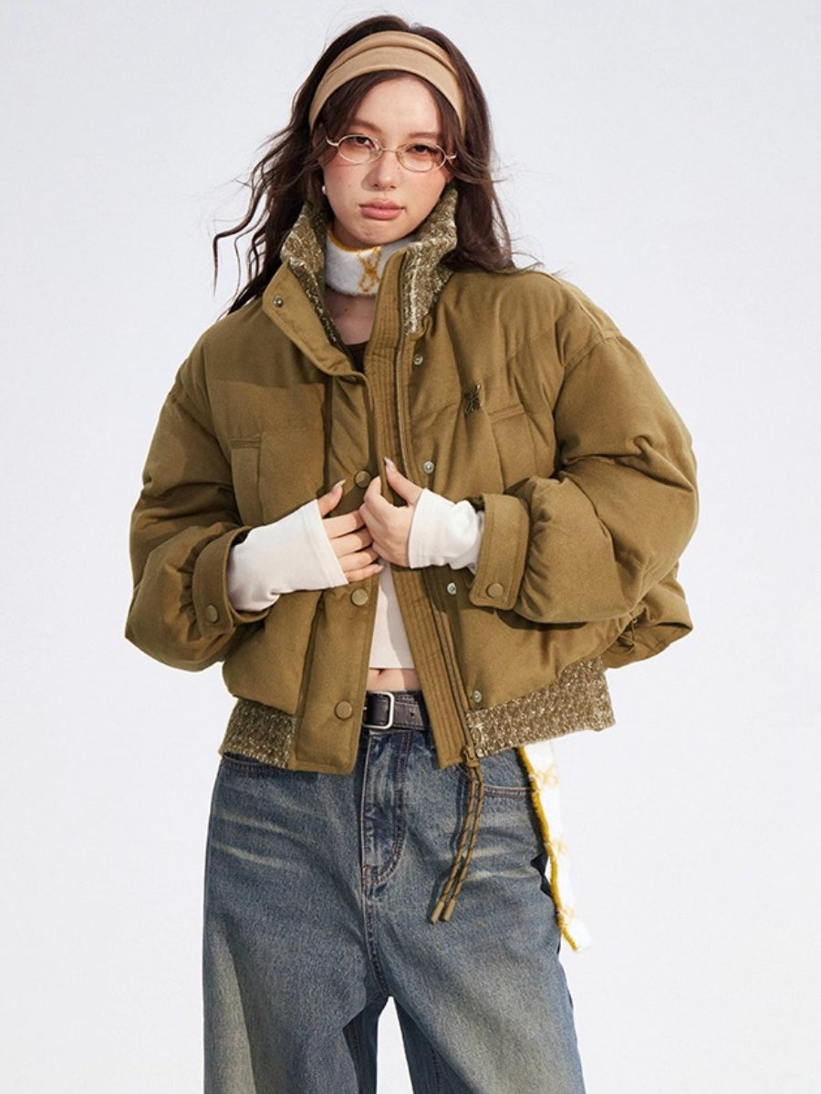 A chic short down jacket blending warm knit textures with thick wool panels for enhanced insulation and a refined layered look. Filled with 90% white duck down, it delivers superior warmth while maintaining a sleek silhouette. The cropped design elongates the body proportion, making it ideal for daily wear in cold weather.