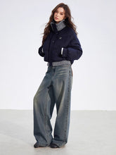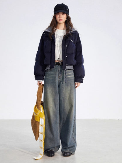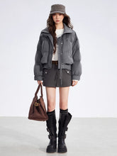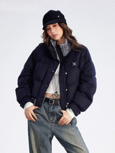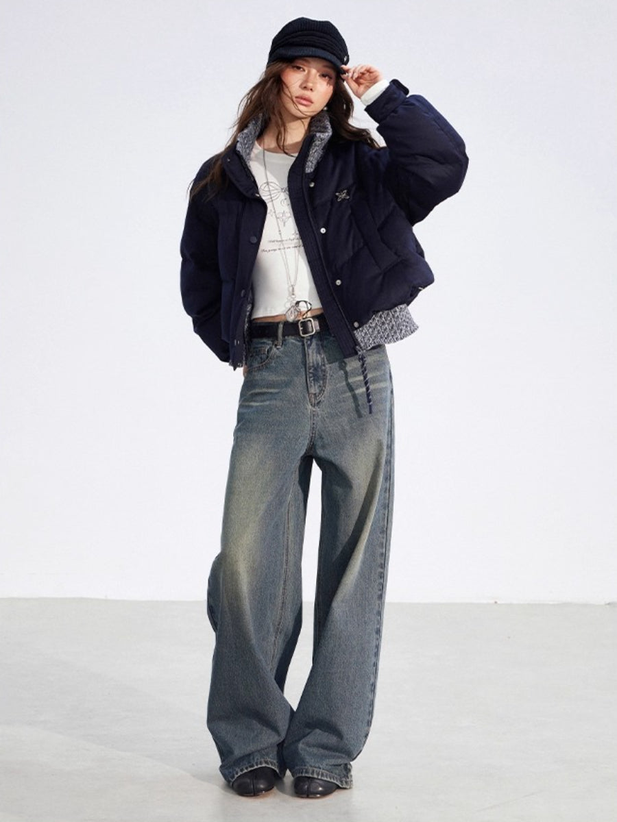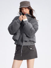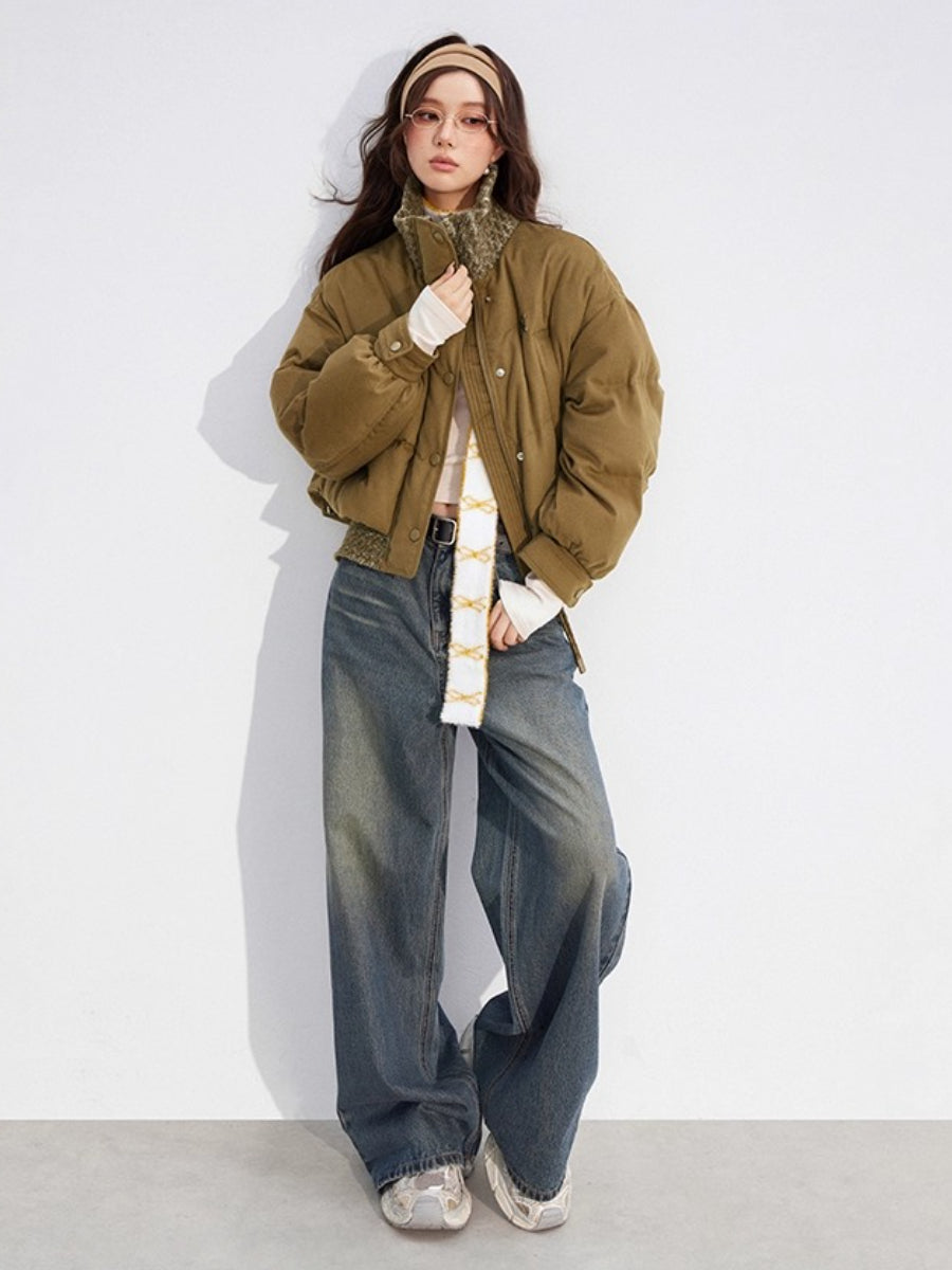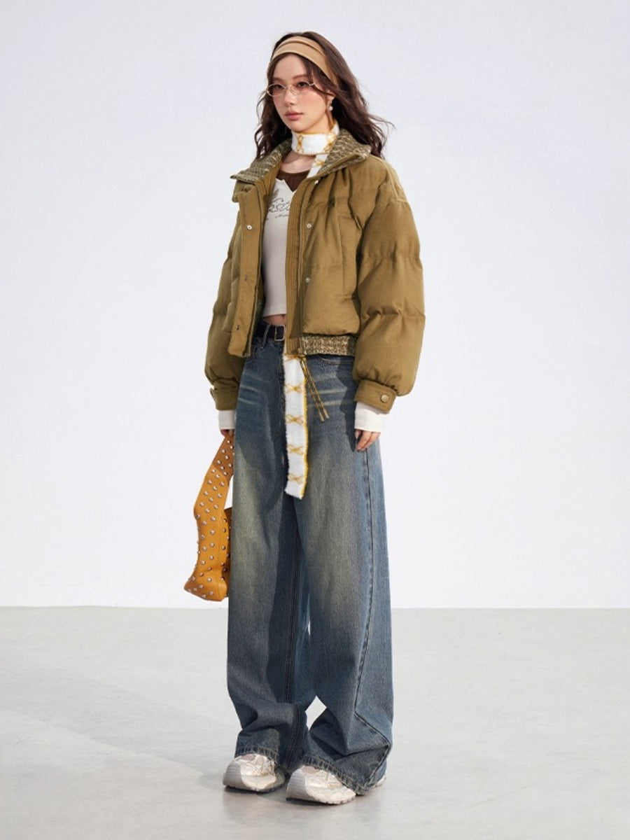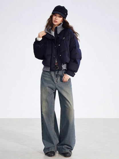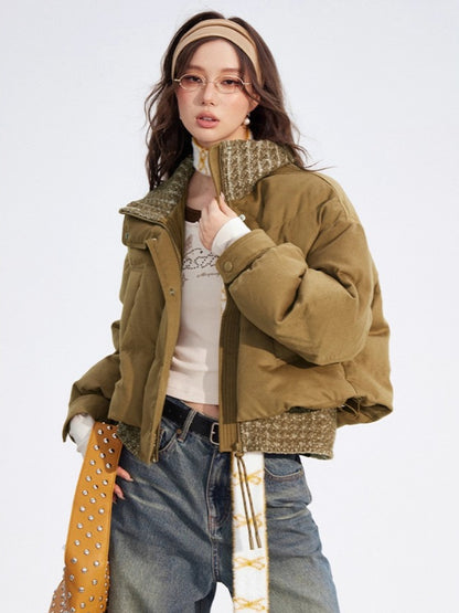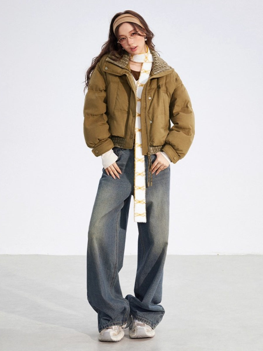 A chic short down jacket blending warm knit textures with thick wool panels for enhanced insulation and a refined layered look. Filled with 90% white duck down, it delivers superior warmth while maintaining a sleek silhouette. The cropped design elongates the body proportion, making it ideal for daily wear in cold weather.