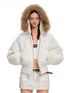 This short down jacket combines high-density eco-friendly faux fox fur with a glossy technical shell for a refined winter statement.