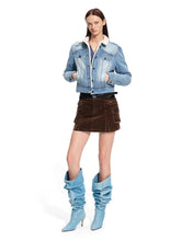Crafted from heavyweight washed twill denim in 100% cotton, this jacket combines structured denim with plush faux-shearling warmth. Indigo-dyed for depth and vintage fade, each piece features unique tonal variation from multiple washing treatments. The contrast between the soft fleece collar and rugged denim body adds texture and dimension, while the quilted logo jacquard lining offers warmth and brand detail. The cropped, tailored silhouette flatters while ensuring easy layering across seasons.
