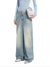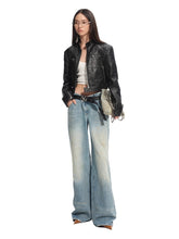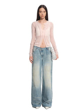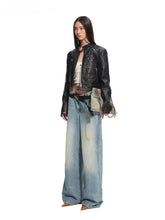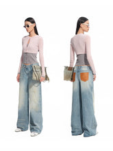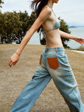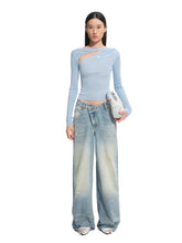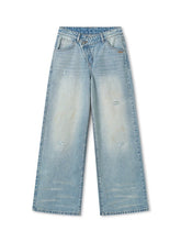 Low-rise silhouette featuring a diagonal crossover placket that defines the waist. Finished with a custom LOGO metal button and signature back embroidery for refined detail. Hip pockets accented with leather add sophistication, while the heavy-wash denim with hand-rubbed whiskers enhances texture and contrast.