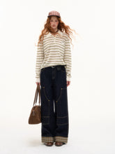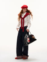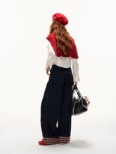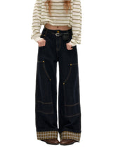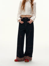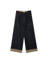 These wide-leg denim pants feature a structured straight cut that balances comfort with shape. Designed with plaid splicing and fold-over hem detail, they offer a subtle statement beyond basic jeans. Large functional pockets and raw denim fabric ensure durability and everyday versatility.