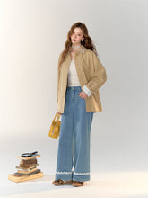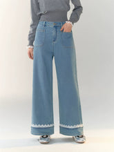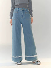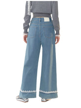 These straight-leg denim jeans are designed with a lace band for added style and comfort. Made from high-quality cotton material, they are perfect for casual wear with an elegant touch. The versatile design makes them ideal for pairing with various tops and shoes. These jeans offer a flattering fit that combines both comfort and fashion.