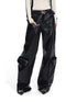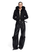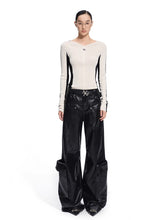 These statement wide-leg pants are crafted from eco-friendly lychee-textured faux leather with a naturally grained surface and subtle gloss. The supple PU leather is processed for a slightly aged texture, combining visual edge with practical durability. Designed with a mid-rise waist, four-pocket layout, and branded metal rivets, they balance structure and freedom of movement. The YKK zipper closure ensures smooth functionality and lasting wear, giving the piece both punk attitude and refined finish.