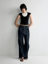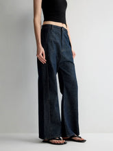 These jeans feature a low - rise drop - crotch design and a slimming inverted pleat design.