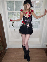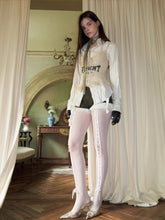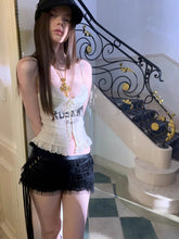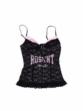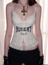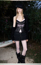 This lace-trimmed corset top is tailored with a structured, body-contouring silhouette that closely follows natural curves for a refined and flattering fit. The mid-length cut adapts easily to different waist proportions, creating a balanced and elegant layered look. Crafted from high-stretch lace fabric and reinforced with a premium elastic mesh lining, it offers both support and breathability. Delicate printed lettering and lace detailing enhance the visual depth, delivering a bold yet feminine style that balances sensuality with everyday wearability.