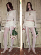Designed in a high-waist silhouette, these ultra-short chiffon cake shorts feature layered chiffon and snow-yarn panels that build a light, airy, and voluminous structure. Delicate lace trim and a butterfly bow detail at the waistband add a soft, romantic finish while enhancing feminine texture. The multi-tier construction creates a cloud-like visual effect that feels playful yet refined. Lightweight and breathable, this piece works effortlessly with fitted tops, knitwear, or cropped silhouettes for everyday styling with a statement edge.