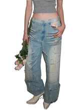 Crafted from heavyweight pure cotton denim, these pants feature a vintage-inspired washed finish with subtle distressing for a naturally worn-in look. The low-rise, straight-leg silhouette is designed with a relaxed, utilitarian structure that balances ease and definition. Panelled construction and three-dimensional leg detailing break conventional denim lines, adding both functional depth and visual interest. Finished with hand-applied ink accents and artisanal dyeing, this piece delivers a strong retro character suitable for everyday styling.