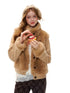 This soft yet structured jacket features an eco-faux fur knit construction with a clean stand collar and subtle panel splicing for a refined layered look. The relaxed silhouette balances warmth and lightness, making it easy to style for everyday wear without bulk. Designed with thoughtful texture contrast and a naturally draped fit, it delivers both comfort and understated elegance for transitional seasons.
