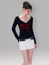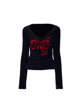 Crafted from a dense short-pile knit, this sweater delivers a soft, skin-friendly touch with enhanced warmth and structure. The bold black-and-red jacquard motif creates strong visual impact, while the V-neckline sharpens the neckline and adds a subtle sensual edge. Designed with a fitted silhouette and high elasticity, it hugs the body comfortably without feeling restrictive. Finished in a regular length, it works seamlessly as a standout inner layer or a statement piece on its own.