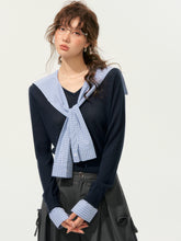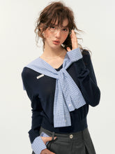 This is a chic fake two-piece twist-knot spliced V-neck knit top. With its unique twist-knot and spliced design, it offers a fashionable and cozy wearing experience, ideal for enhancing your style.