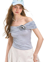 This is a striped off - shoulder rose T - shirt. The striped design brings a sense of fashion rhythm, the off - shoulder style shows a touch of sexiness, and the rose element adds a romantic and delicate feeling. It's perfect for creating a stylish and charming look in daily wear.