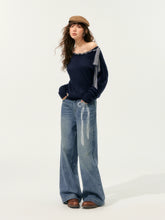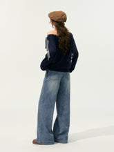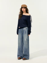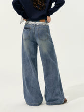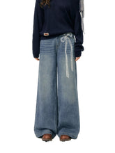 These are stylish lace printed wide-leg jeans. Featuring a unique lace print design, they offer a trendy and comfortable fit, perfect for adding a touch of fashion to your wardrobe.