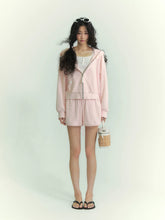 A comfortable three-piece set featuring a waffle-textured hoodie, matching shorts, and a fitted vest, crafted from a soft polyester-cotton blend. The versatile design allows mix-and-match styling for casual or athleisure looks. Adjustable fit and relaxed cut ensure comfort for everyday wear. Functional details include hood drawstrings, elastic waistband shorts, and a cropped vest for layered styling.