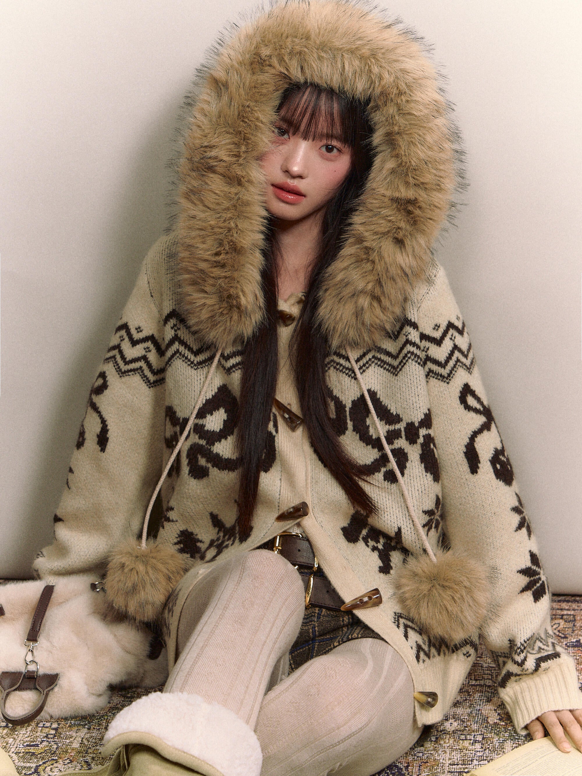 Fair Isle Fur Collar Toggle Knit Coat -