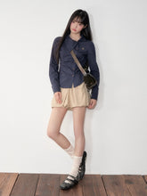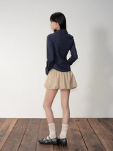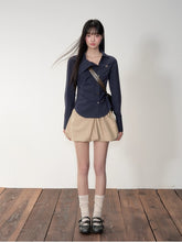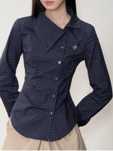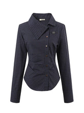 Designed with an asymmetric lapel collar and waist-cinching cut, this long-sleeve shirt enhances body proportions with a tailored silhouette. The irregular plaid pattern adds a retro touch, while branded metallic pin details bring subtle accents. Comfortable yet refined, it balances structured lines with wearability for a versatile preppy look. Finished in a deep navy plaid for a classic understated vibe.