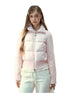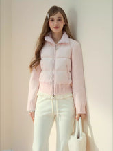 Featuring a soft strawberry-milk pink hue, this lightweight down jacket combines knit textures with a feather-filled interior for warmth and coziness. The 100% cotton plaid lining adds a preppy touch, while ribbed knit cuffs and hem enhance insulation. Finished with double zipper pockets, custom butterfly metal logo pulls, and contrast detailing, it merges sweetness with functionality for both daily wear and campus style.