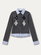 A preppy knit top that reimagines vintage charm with modern craftsmanship. This piece features a faux two-piece design combining a shirt collar and cuffs with a slim cable-knit sweater body, achieving a refined layered look. The argyle pattern adds a touch of academia, while the soft blended yarn ensures comfort and resilience. Available in light gray and dark gray, each tone enhances its classic collegiate vibe with delicate contrasting trims. Perfect for creating effortless layered outfits that transition seamlessly between casual and polished occasions.