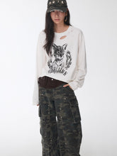 Distressed Cat Graphic Long Sleeve Cotton T-shirt
