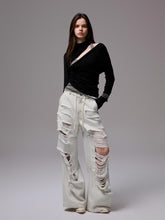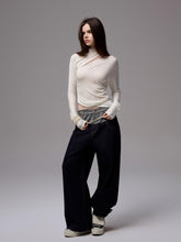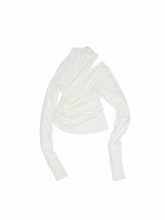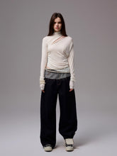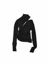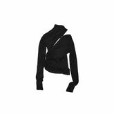 This long sleeve blouse features a mock neck and asymmetric draped construction. The left shoulder showcases a diagonal cutout, subtly revealing the collarbone and shoulder. Designed with a relaxed fit for effortless layering, it flatters the waist with sculpted pleats and irregular hems for a deconstructed, fashion-forward look. The back cutout enhances styling flexibility. Crafted from lightweight lyocell-wool fabric, it feels soft, smooth, and resistant to sagging, maintaining the structure of the loose silhouette.