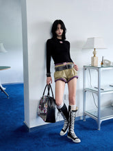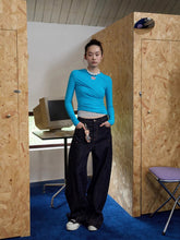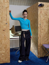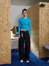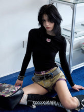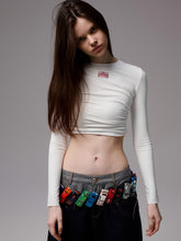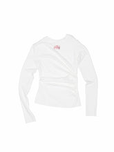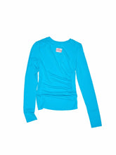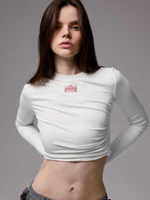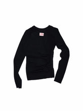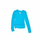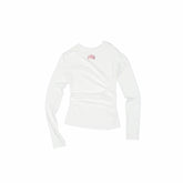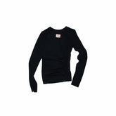 A fitted long-sleeve blouse crafted with a round neckline and ruched detailing at the shoulders and waist for a flattering slim effect. The asymmetrical gathered design highlights the figure while enhancing proportions. Finished with a custom cat fang rhinestone embellishment, adding playful detail to this chic piece. Made from stretch ribbed fabric, ensuring comfort, flexibility, and a close fit without tightness.