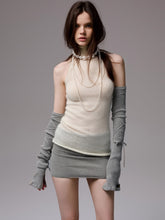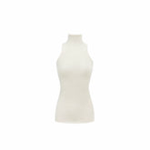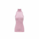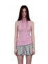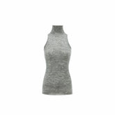 This sleeveless high-neck vest is crafted with a slim fit silhouette and mid-length cut to flatter body curves. The collar features delicate rolled edges for refined detail. Knitted with an ultra-soft mohair wool blend, the fabric is breathable and skin-friendly. Designed with a special 7-gauge single-face knitting technique, it offers a dense, textured feel. Finished with a custom rhinestone label at the back, adding a sense of detail and modern edge.