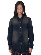 This washed denim shirt features a structured, regular-shoulder silhouette that flatters the body while maintaining a sharp, modern look. The hemline tapers slightly to create a natural drape, complemented by distressed frayed edges for an effortlessly styled finish. Crafted from premium 100% cotton twill denim, the fabric is dense yet breathable, offering a natural, shaped fit. The heavy-wash treatment in deep indigo blue enhances the vintage texture and depth of color, exuding both retro character and refined craftsmanship.